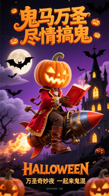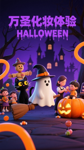 3d卡通风格,画面16:9竖版,背景为深紫色调的万圣节夜晚,融入朦胧的哥特式城堡剪影与枯树轮廓;画面中心是一只造型软萌的白色幽灵,头戴带有橙色腰带扣的黑色巫师帽,坐在棕色扫帚上;扫帚后面装着一只搞怪圣诞稻草人,扫帚左侧有一只黑毛黄眼的卡通猫(身旁点缀橙色糖果),右侧有一个4岁左右的可爱小朋友坐在发光的橙色南瓜灯上,美女化妆师正在给小朋友化万圣节彩妆,南瓜灯的左右还有两个小朋友在等