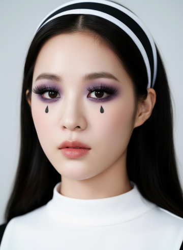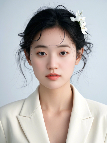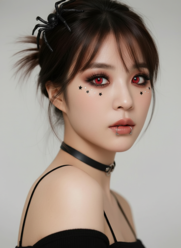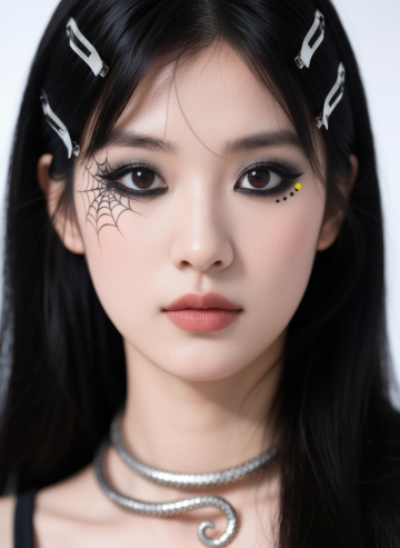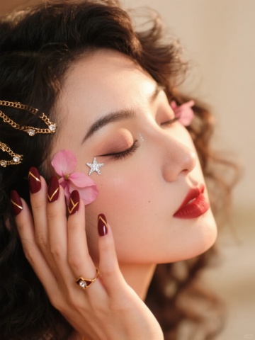 超写实人像摄影,柔和自然光从左上方照射,形成细腻的明暗过渡和柔和阴影,浅米色背景,女性侧脸特写,精致五官,闭着双眼,唇色为自然裸粉色,面部点缀银色小亮片、立体粉色花瓣和白色小花装饰,发丝优雅盘起,耳边垂落粉色花瓣装饰;手部轻托下巴,全新美甲设计采用深邃酒红色渐变底色,指尖镶嵌不规则切割的黑色水钻与银色金属链条装饰,搭配哑光质感黑色蝴蝶结立体甲片;整体妆造变换为冷艳暗黑系风格,眼妆以深棕与墨黑色眼影晕染出深邃烟熏效果,眼尾点缀细小黑色羽毛,唇妆改为哑光正红色,面部保留少量银色亮片但增加黑色小珍珠点缀,营造神秘优雅的暗黑氛围,画面保持高清细腻的皮肤质感和柔和的光影层次,色彩对比增强,突出冷艳与精致的视觉冲击。