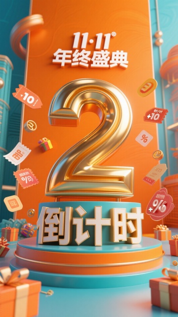3D微缩艺术风格,鎏金与橙色主调营造喜庆促销氛围,重拟物设计结合卡通元素,呈现双十一购物狂欢节的热闹场景。