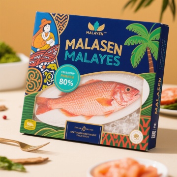 极简风格零食包装袋,简洁深蓝色大色块背景,中央位置有三文鱼形状的透明开窗,窗内展示金黄色香辣三文鱼干实物,白色英文字体“DRIED SALMON”作为主视觉居中排列,底部有白色信息框包含产品描述文字,高质感牛皮纸质材质,会员商店专供风格,现代简约美学,正面视角,高清细节