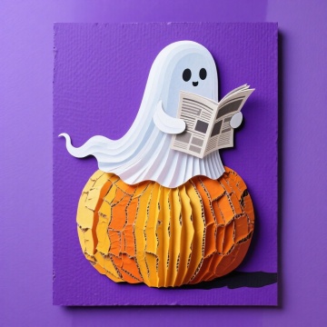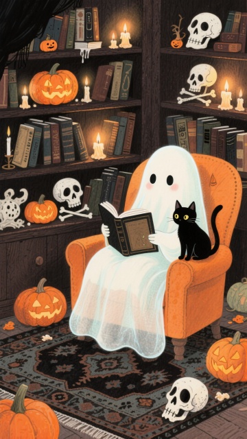 插画风与拟人风结合,卡通感十足的幽灵在温馨书屋中阅读,黑猫相伴,南瓜灯与骷髅点缀,营造出故事感十足的万圣节氛围。