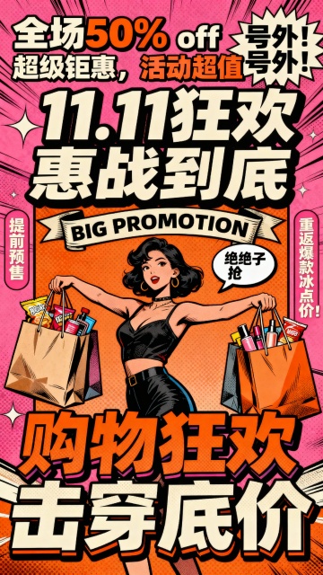 潮流复古漫画风格海报,高饱和粉、橙、黑色为主色调,视觉冲击力强,画面丰富有层次。上方中等大小字体显示“全场 50% off”“超级钜惠,活动超值”,搭配稍大字体的“号外!号外!”吸睛标语;中间大号艺术字突出“11.11 狂欢”“惠战到底”,营造热烈促销氛围;核心是复古漫画画风的时尚女性,双手各提装满商品的购物袋,袋口露出零食、美妆小件,姿态舒展有活力;周围穿插小号字体“提前预售”“重返爆款冰点价!”,搭配中等字体“BIG PROMOTION”装饰带和“绝绝子 抢”对话框;下方大号立体文字“购物狂欢 击穿底价”,整体聚焦购物场景,传递热闹、超值的双11购物狂欢感