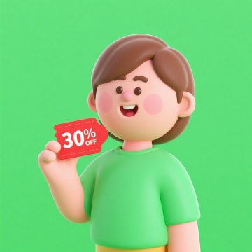 软3D风卡通人物,粘土质感造型,手持¥5标签,紫色背景强化视觉冲击,节日促销氛围浓厚。