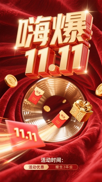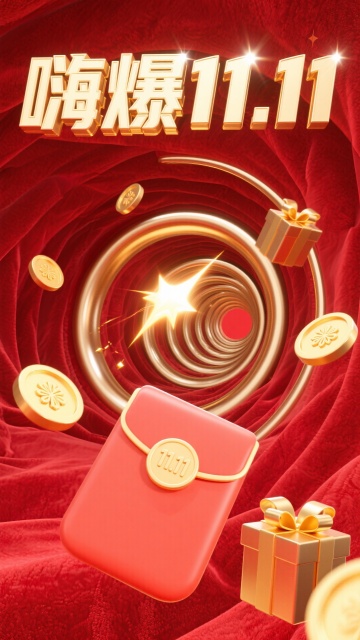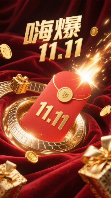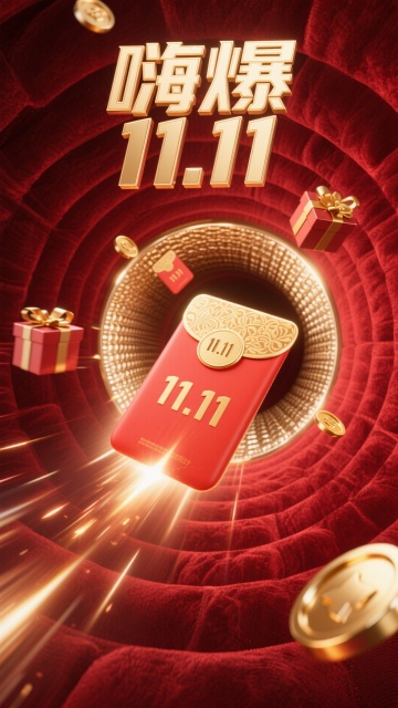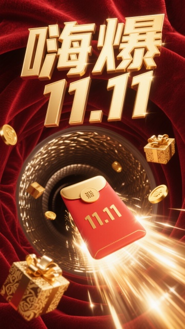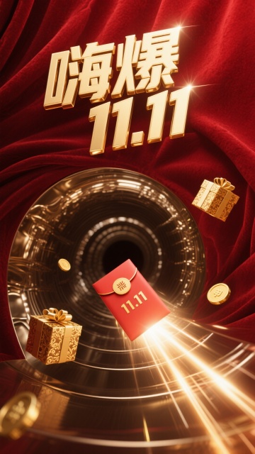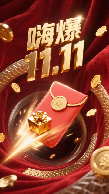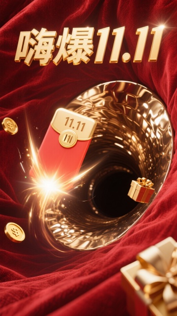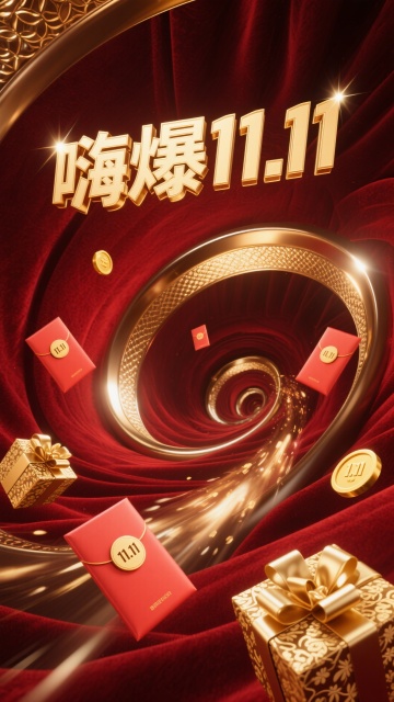 8K 超高清画质,如电影级商业广告画面般精致,摄影级别的专业呈现。画面以浓郁的红色作为背景主色调,仿佛是红丝绒质地,散发着奢华且热烈的光泽。醒目的标题 “嗨爆 11.11” 以立体金色大字呈现,字体边缘闪烁着光芒,极具视觉冲击力。红包如流星般从螺旋通道高速飞出,红包表面清晰印着 “11.11”,通过细腻的光影刻画,高光部分闪耀着金属质感,暗部则深邃神秘,凸显红包的立体感与动感。螺旋通道向远处的消失点延伸,通道内壁有着金属的光泽和纹理,营造出强烈的空间纵深感。通道内部有几个礼盒与金币不规则地漂浮着,礼盒包装精致,金色的花纹与红包相呼应,金币反射出耀眼的光芒,增添画面的华丽感。整体画面通过巧妙的光影运用,着重突出红包的主体地位,同时营造出神秘深邃的氛围。