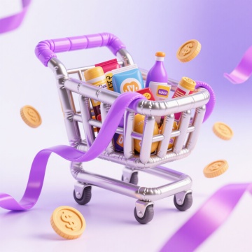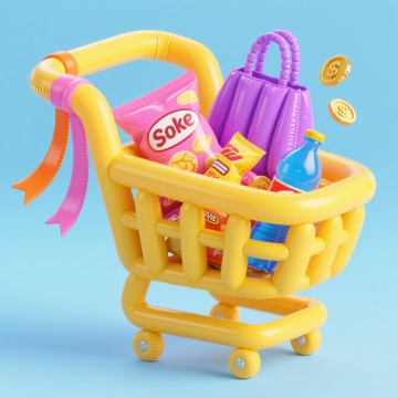 软3D风格购物车,充气质感搭配彩色购物袋与金币,波普艺术色彩碰撞,营造可爱卡通喜庆氛围。