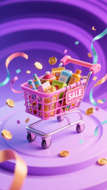 3D风购物车,拟人化商品,塑料质感,可爱卡通风格,节日促销氛围。