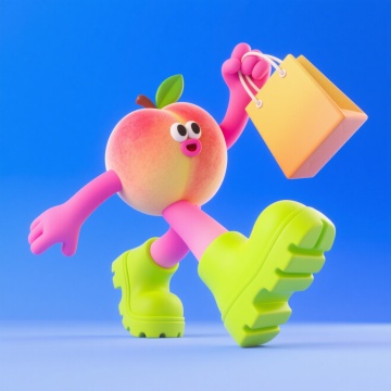 拟人的粉色的桃子在逛街,手提购物袋,背景是蓝色。