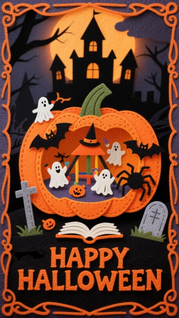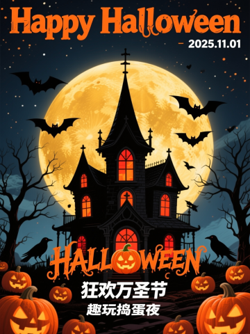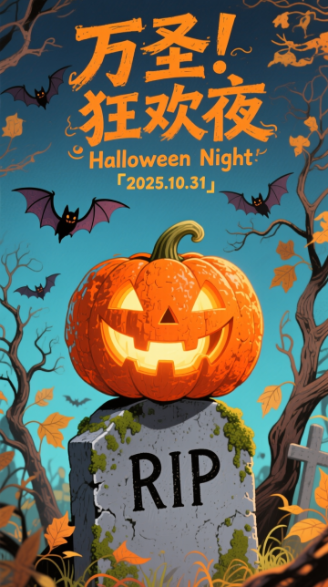 插画风扁平设计,拟人南瓜戴巫师帽,搭配蝙蝠与魔法药水,大字风“HAPPY HALLOWEEN”充满卡通感与喜庆趣味,营造欢乐万圣节氛围。