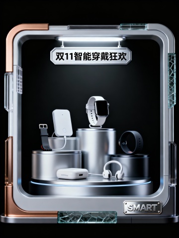科技感十足的3D重拟物风设计,金属与玻璃材质交织,呈现未来感智能穿戴产品展陈,双11节日氛围浓厚。