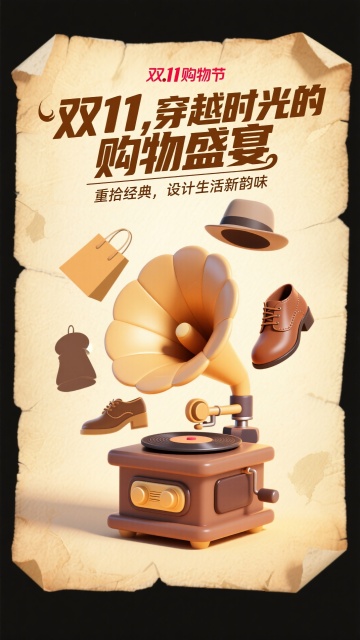 复古木雕风融合微缩艺术,皮革质感文字与暖色系拼贴元素营造质朴温馨氛围,搭配秋冬季主题道具,传递舒适趣味的双11促销感。