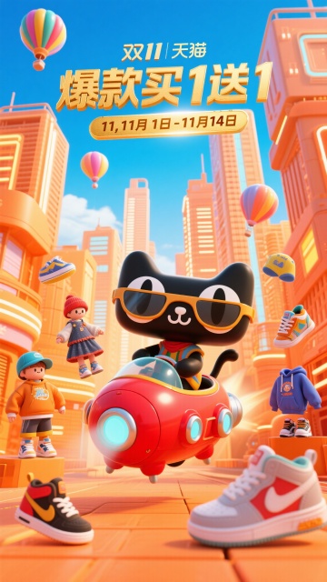 赛博朋克风3D插画,黑猫戴墨镜弹吉他坐购物车,霓虹灯渲染夜光唱片行,融合未来感与促销趣味,双11主题酷炫吸睛。
