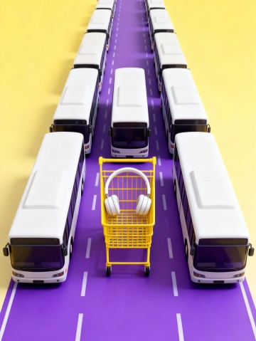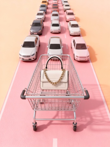 3D 卡通风格,以淡蓝色为主色调的室外场景,顶部视图,浅蓝色道路上堵着两排卡通汽车车流,有的车顶上有白色 “满减” 霓虹灯牌;中间一排车流中有一个蓝色购物车,装着手机,地面散落蓝色碎纸;整体色彩以蓝、白、灰、银为主,层次丰富协调。