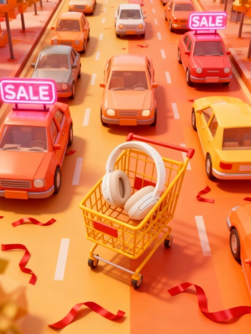 科技感与未来感交织的3D微缩场景,卡通风格汽车穿梭于霓虹灯风道路,购物车中手机象征数字消费,塑料质感强化视觉冲击,满减标识点亮节日促销氛围。