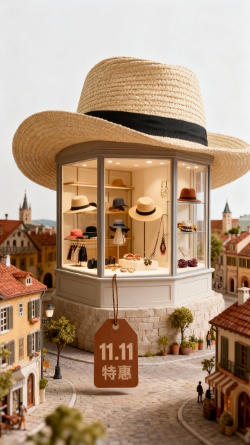 复古胶片风与微缩艺术结合,3D重拟物相机化身眼镜店,金属质感与文艺街景交织,趣味十足的11.11促销场景。