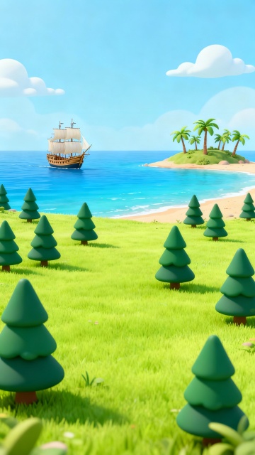 清新软3D风,卡通海岛场景,椰树、躺椅与冲浪板,夏日度假氛围。