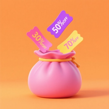 软3D风格粉色钱袋,溢出多彩折扣券,塑料质感搭配明亮色块,营造强烈促销氛围,适合节日营销视觉。