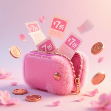 粉嫩毛绒钱包溢出七折券与金币,软3D风结合重拟物设计,樱花飘落营造梦幻甜蜜感,节日氛围浪漫可爱。