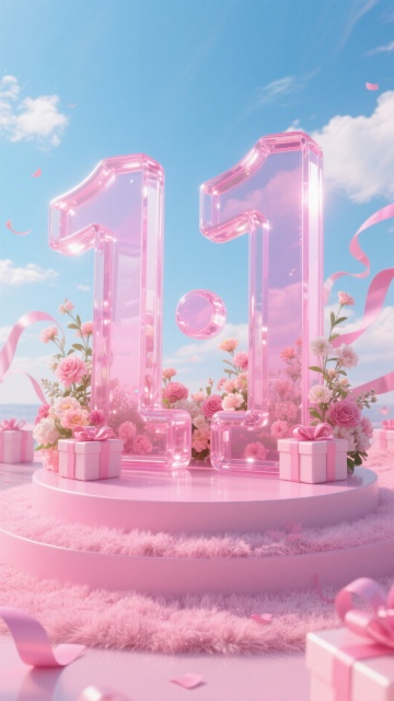 梦幻粉色玻璃风“11”数字立于花海,3D轻拟物设计,搭配柔美丝带与礼盒,营造甜蜜清新节日氛围。