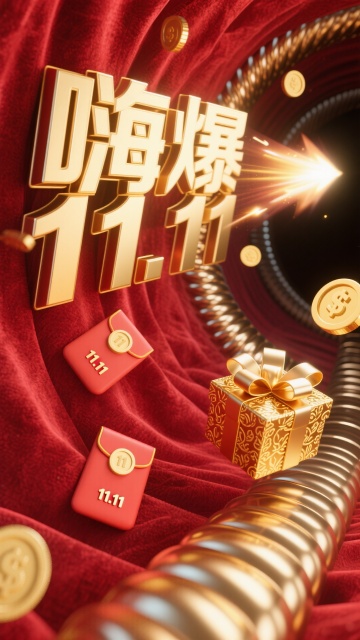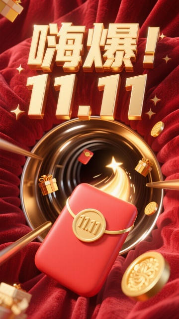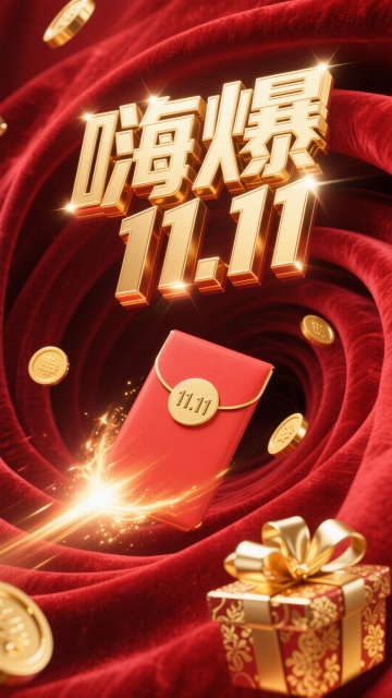鎏金浮雕字体搭配3D重拟物风格,红金交织的丝绒漩涡营造奢华光影感,金币与礼盒点缀,强化喜庆氛围,凸显双十一节日狂欢。