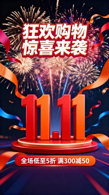3D立体大字搭配霓虹光效,金属质感数字“11.11”置于炫彩舞台,烟花与粒子流营造喜庆氛围,强化促销感与节日狂欢体验。