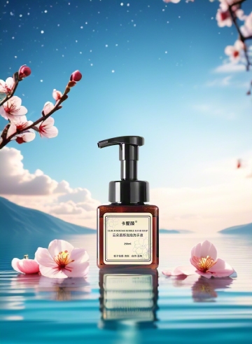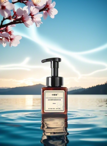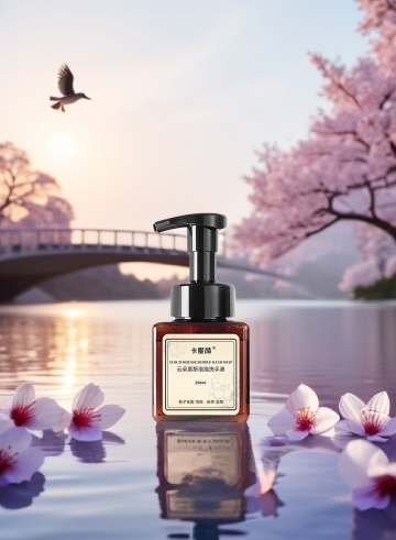 一张洗发水产品图,瓶子是高级磨砂透明质感(800ml容量),里面是淡橘色的液体,产品置于棕色木桩展台上,置于平静的水面上,右边有木料,有青苔,有雪松,有半个橙子,旁边点缀干枯的红色植物,背景是渐变的米棕色调,营造出高端、质感、朦胧,自然的氛围 。整体打造出独特、凸显产品修护功效与高端品质的视觉效果,吸引注重肌肤修护、追求高品质护肤产品的消费者