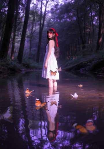 梦幻紫林中,少女立于水镜之上,蝴蝶翩跹,光影交织,虚实相映,动漫风与水彩质感融合,营造唯美感与静谧浪漫的虚拟自然意境。