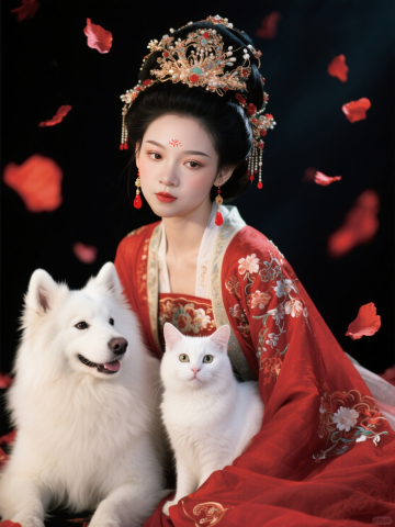 一位身着红色古风服饰的女子,她的服饰上装饰着精美的花纹和饰品,头上戴着华丽的头饰,耳间挂着红色耳饰,尽显华贵。女子身旁依偎着一只白色的狗和猫,狗和猫的毛发洁白柔顺,眼神明亮。背景为深色,飘落的红色花瓣增添了神秘而浪漫的氛围,整体画面给人一种奇幻且唯美的感觉,蕴含着与狗和猫相关的奇幻故事元素。