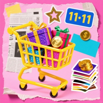 软3D风格购物车满载红包与礼盒,粉色“11.11”悬浮其上,搭配黄色流线背景,营造喜庆、促销、可爱又充满卡通感的双11节日氛围。