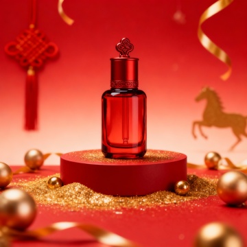 红金配色,中式结与奔马剪影烘托喜庆氛围,鎏金质感与重拟物设计融合国潮风韵,金属光泽瓶身彰显奢华感。