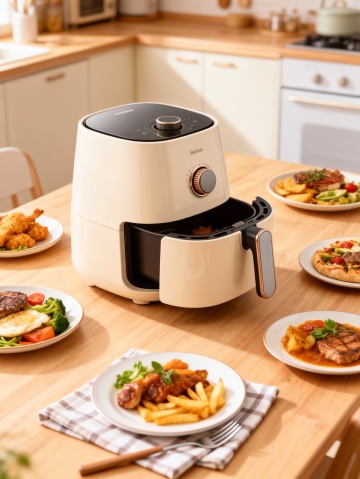 现代简约风格空气炸锅,白色主体搭配金色装饰,弧形提手,圆形控制面板,展示产品的正侧视角,突出机身线条和侧面轮廓,背景为浅米色竖条纹肌理,光线柔和,高质感材质表现