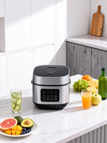 一个现代风格的电饭煲产品展示图,整体采用简约设计语言,主体为圆柱形结构,顶部为平面设计,带有微凹的开盖按钮和一个细长的蒸汽孔。机身正面有一个矩形控制面板区域,内有数字显示屏和多个功能按键,按键上有简洁的中文标识。产品采用不同配色方案,包括哑光白色与浅灰色渐变、磨砂质感的淡蓝色、珍珠光泽的米白色,以及带有细腻拉丝纹理的浅香槟金色等多种浅色基调的材质。整体造型线条流畅,边角圆润,体现出现代家电的精致感与科技感。背景为纯净的浅色(如浅灰色或乳白色),采用柔和的正面光源,光线均匀分布,在产品底部形成轻微的阴影,突出主体的立体感和材质细节,整体画面干净整洁,具有清晰的产品展示效果,类似专业的电商产品白底图风格,无任何文字、LOGO及多余装饰元素。