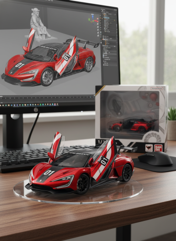 将这个图片制作成一个商业化1/7比例手办,风格写实,环境逼真。手办放置在电脑桌上,配有一个圆形透明亚克力底座,底座上没有文字。电脑屏幕上显示着手办的Zbrush建模过程。电脑屏幕旁边是一个万代风格的透明玩具盒,上面印有原始画作。