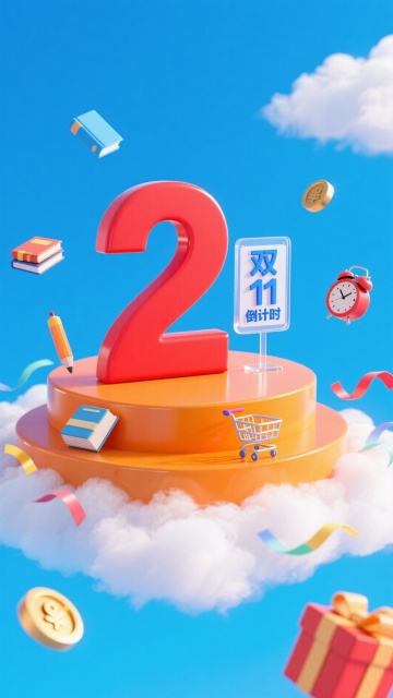 3D充气风数字“2”主导画面,融合波普艺术色彩与重拟物质感,搭配卡通气球、礼盒营造喜庆促销氛围,双11囤货季倒计时主题鲜明。