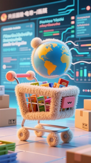 软3D风购物车,搭载地球仪,背景科技感十足,展现未来虚拟现实购物体验。