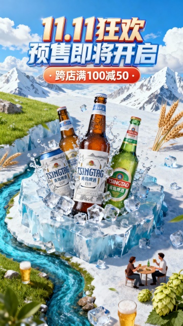 3D微缩艺术风融合虚拟现实场景,冰川溪流环绕青岛啤酒,粒子飞溅营造清爽梦幻感,冲击视觉,传递11.11狂欢预售的激情氛围。