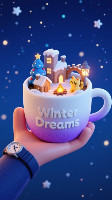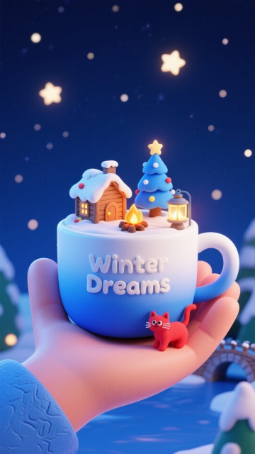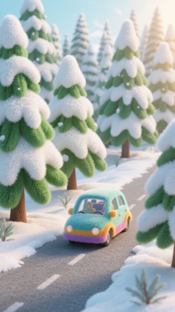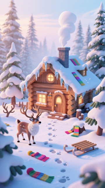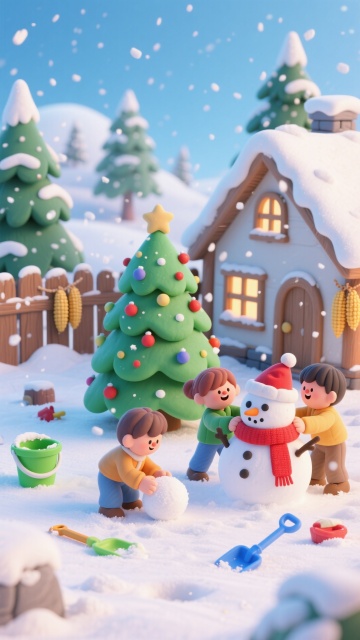 俯视视角(强透视俯看猫眼的镜头),画面中的人物呈现出仰视镜头的姿态,3D卡通渲染,童趣节日风,色彩鲜艳明快,光影柔和且富有节日氛围感,材质表现写实且带可爱质感(如毛绒、光泽、蓬松肌理)。戴着红色圣诞帽和白色毛领的圣诞老人、戴着黑色礼帽和绿色围巾的雪人,以及戴着蓝色围巾和红色手套的驯鹿,三者共同捧着一个红色带黄色蝴蝶结的礼物盒。他们身后雪橇车,雪橇内堆满彩色礼物盒(红、绿为主,配金色蝴蝶结,包装纸有哑光与光泽质感对比)。背景是圣诞小镇场景,两侧是红色尖顶房屋(屋顶积雪蓬松,窗户透出暖黄色灯光),街道两侧有装饰彩灯的圣诞树(绿色带雪,点缀彩色球和铃铛);远处街道纵深延伸,被雪景和灯光笼罩,营造空间纵深感;天空飘着动态雪花(大小不一,带轻微透明感)。蓝紫色渐变的夜空,点缀白色雪花和光斑;房屋间悬挂的节日串灯,地面蓬松的白色积雪(带柔和阴影,体现立体感)。中心聚焦+纵深构图,前景以圣诞老人、雪人和驯鹿为视觉核心,占据画面下半部分;中景是街道两侧的房屋、驯鹿、圣诞树;远景是纵深的小镇街道,通过色彩渐变和元素大小对比强化空间层次,引导视线向画面深处延伸。圣诞老人服装:红色面料带轻微哑光,白色毛绒边蓬松柔软,有细腻的绒毛纹理;礼物盒:包装纸分哑光(红色)和光泽(绿色、金色蝴蝶结)两种质感,蝴蝶结有丝绸光泽;雪橇:金色部件为金属光泽质感,红色部分是哑光漆面;积雪:蓬松柔软,表面带柔和阴影,体现雪的颗粒感;房屋:红色墙面哑光,屋顶积雪蓬松,窗户灯光暖黄且有透光感。主光源为暖黄色,集中在圣诞老人、礼物盒和房屋窗户,营造节日温馨感;天空雪花带轻微自发光,与背景蓝紫色夜空形成冷暖对比;积雪表面有环境光反射,呈现柔和的白色高光;整体光影过渡自然,无硬阴影,强化卡通可爱的视觉风格。充满童趣的圣诞节日氛围,通过鲜艳色彩、可爱造型和动态雪花,传递欢快、温馨、充满惊喜的节日情绪。