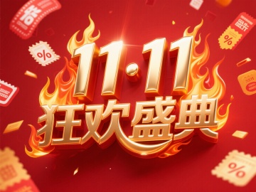 3D鎏金大字搭配火焰粒子,金属质感与喜庆红背景碰撞,营造热血促销氛围,双11狂欢盛典尽显体积感与视觉冲击力。