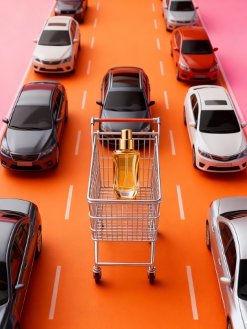 3D微缩艺术风,购物车穿行于车流中的香水瓶,金属质感与玻璃光泽交织,时尚潮流与科技感碰撞,虚拟现实般的视觉奇观。