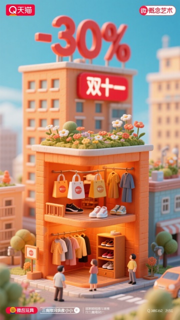 软3D风格微缩城市,卡通感十足的双十一促销场景,粘土质感建筑搭配萌趣人物,营造可爱又吸睛的节日购物氛围。
