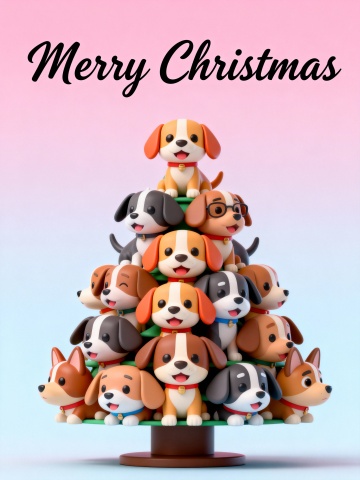 软3D粘土风萌犬堆叠成圣诞树,卡通可爱,喜庆氛围浓厚,节日感十足。