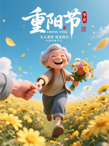 3D卡通渲染风格,平视视角,居中构图,一对卡通黏土质感的老年夫妇,老爷爷戴眼镜、贝雷帽,身着休闲外套与背心,老奶奶白发戴眼镜穿休闲装,相互扶持立于形态饱满的橙黄色菊花丛中,背景是模糊秋景(橙黄叶树木),细腻黏土触感,暖色调(橙黄为主)温馨氛围,大师级排版,手写创意书法字体“重阳节”搭配拼音“chongyang”,下方文案“爱别等,孝别迟 你陪我长大,我陪你到老”,治愈系商业海报,光影柔和,细节丰富,OC渲染,超细节