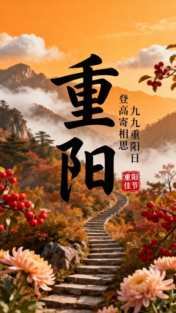 水墨风与工笔技法交融,大字书法凸显中式古典韵味,虚拟自然山水静谧唯美,重阳登高寄相思,尽显节日诗意。