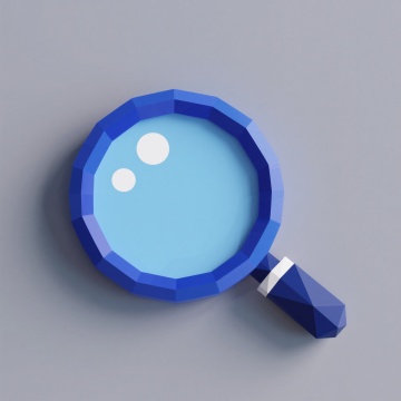 以低多边形3D风格呈现,蓝色圆形放大镜图标保持主体结构,浅蓝色镜片边缘有深蓝色渐变描边,中心两个白色高光圆点,右侧连接深蓝色手柄及末端白色装饰,表面呈几何面拼接效果,带有柔和阴影和哑光材质质感。