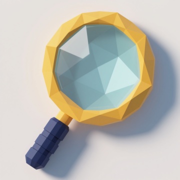 一个采用复古低多边形3D风格的卡通放大镜图标,黄色圆形镜框边缘带有明显的几何切面,透明镜片呈现菱形反光,深蓝色圆柱形手柄带有阶梯状加粗设计,整体由棱角分明的多边形构成,保留白色背景。
