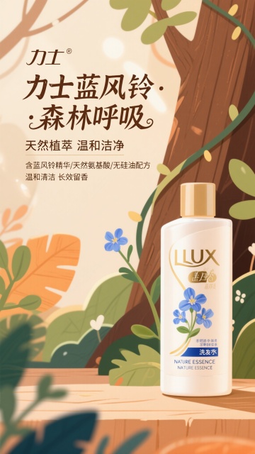 力士蓝风铃洗发水产品主视觉,暖色系森系风格海报。右侧为产品主体,占据画面右部约2/5空间,瓶身30°倾斜放置于木质托盘上,瓶身洁净有细微光泽。左侧为文字区域,背景有渐变光感。主标题“力士蓝风铃 自然森呼吸”,采用优质衬线体,字形舒展,笔触温暖,整体气质清新文艺;副标题“植物精油配方 48小时持久留香”,使用中等粗细无衬线体;核心卖点“天然蓝风铃精华 | 氨基酸洁净 | 无硅油配方”,以三行两列矩阵排列并配小图标;底部小字“LUX·NATURAL ESSENCE COLLECTION”。周围散落蓝风铃花朵与绿叶,底部添加水面倒影效果,左上角点缀雾化光斑模拟林间阳光穿透感。背景以暖米色为基调,融入夕阳橙、原木棕、薄荷绿等森系色彩,局部用风铃蓝作为产品呼应色。