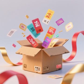卡通感插画风,轻拟物设计,红黄粉配色拼贴式优惠券从钱包飞出,面料质感强化促销氛围,充满可爱与节日欢庆感。