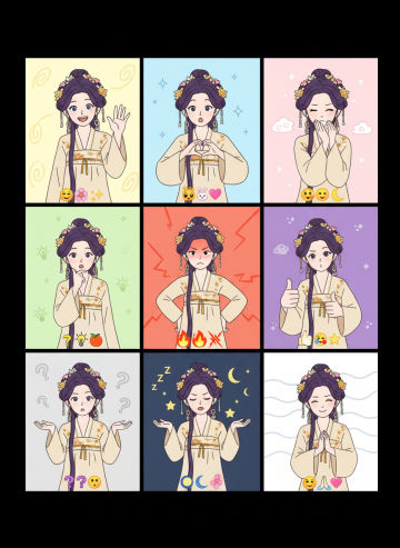 保持人物主体不变,创作一组写实风格表情包,包含表情不同、姿势不同的九宫格表情包,可爱,古灵精怪,随机表情动作搭配组合。