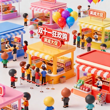 软3D风格微缩城市,卡通感十足的双十一促销场景,粘土质感建筑搭配萌趣人物,营造可爱又吸睛的节日购物氛围。