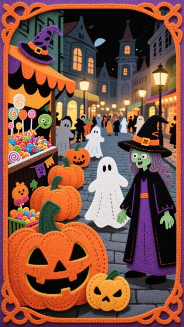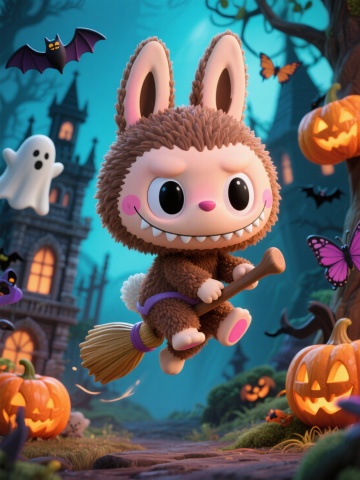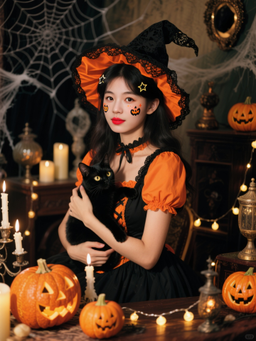 巨型紫色毛绒巴士车头是巨大的猫头(发光黄眼睛、大白牙、头顶小老鼠玩偶),穿着黑色巫师袍、条纹裤、黑色巫师帽,手持南瓜灯,坐在猫巴士旁,表情惊喜。夜晚奇幻场景,南瓜灯、蝙蝠、南瓜头月亮、暗黑城堡剪影、落叶、日式站牌,浓郁暗紫与橙黄的万圣节色调,平拍视角,神秘欢乐的氛围,细腻毛绒质感与光影特效,飞舞的落叶为动态细节,南瓜灯、猫巴士、小老鼠玩偶为道具,暖黄与暗紫交织的人造灯光,暗黑奇幻背景(含城堡、月亮、蝙蝠)
