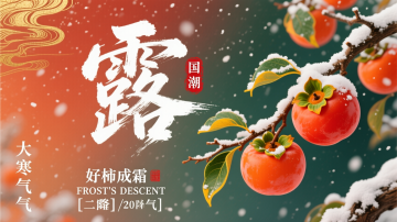 3D卡通插画风格,画面主体为绿色围巾的卡通可爱小男孩,身体比例夸张,头大身体小,面部圆润带红色不明显的腮红,黑色大眼睛呈微笑状,身着橙色背心与紫色灯笼裤,右手高举指向挂满橙红柿子的树枝,左手捧着装满柿子的竹编篮。人物站立于棕色瓦片屋顶(瓦片纹理立体清晰),脚下散落多个带光泽的柿子与黄色银杏叶,右侧地面置有同款式竹编篮(内满装柿子)。背景为浅蓝色渐变天空,左上角延伸出棕色树枝,枝头挂满橙红柿子与飘落的黄色叶片。画面左侧竖排白色书法字体“霜降”(字体飘逸),错落有致的排版,搭配红色边框印章“节气”进行排版,竖排排版,传统中国毛笔书法风格,兼具行书的流畅洒脱与草书的灵动气韵,整体给人一种清雅、富有诗意的感觉,下方配白色宋体小字“二十四节气”,整体以绿、橙、紫为主色调,OC渲染技术呈现高清细节:人物面部光影柔和,柿子表面有通透光泽,竹篮编织纹理分明,背景添加柔和光斑。整体呈现温馨有趣可爱的画面,色彩明快,对比强烈。